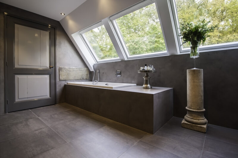 Microcement is perfect geschikt voor gebruik in natte ruimtes en geeft deze badkamer in Naarden een unieke, rustgevende uitstraling.